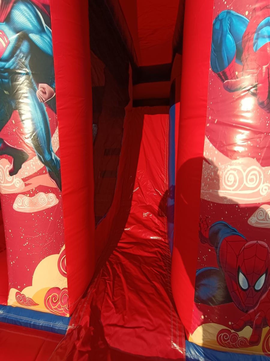 With images of some of the most beloved Marvel characters, including Spiderman, the Incredible Hulk, Superman, and Iron Man, this bounce and slide bouncy castle is sure to be a hit at any event. With a built-in inflatable slide, plenty of space to bounce around in, and beautiful images of some of the most famous crimefighters of the big screen, you'll be leaping with the web-slinger, celebrating with the Man of Steel, bouncing with Bruce Banner and flying high with Tony Stark when you rent this bouncy castle with us.