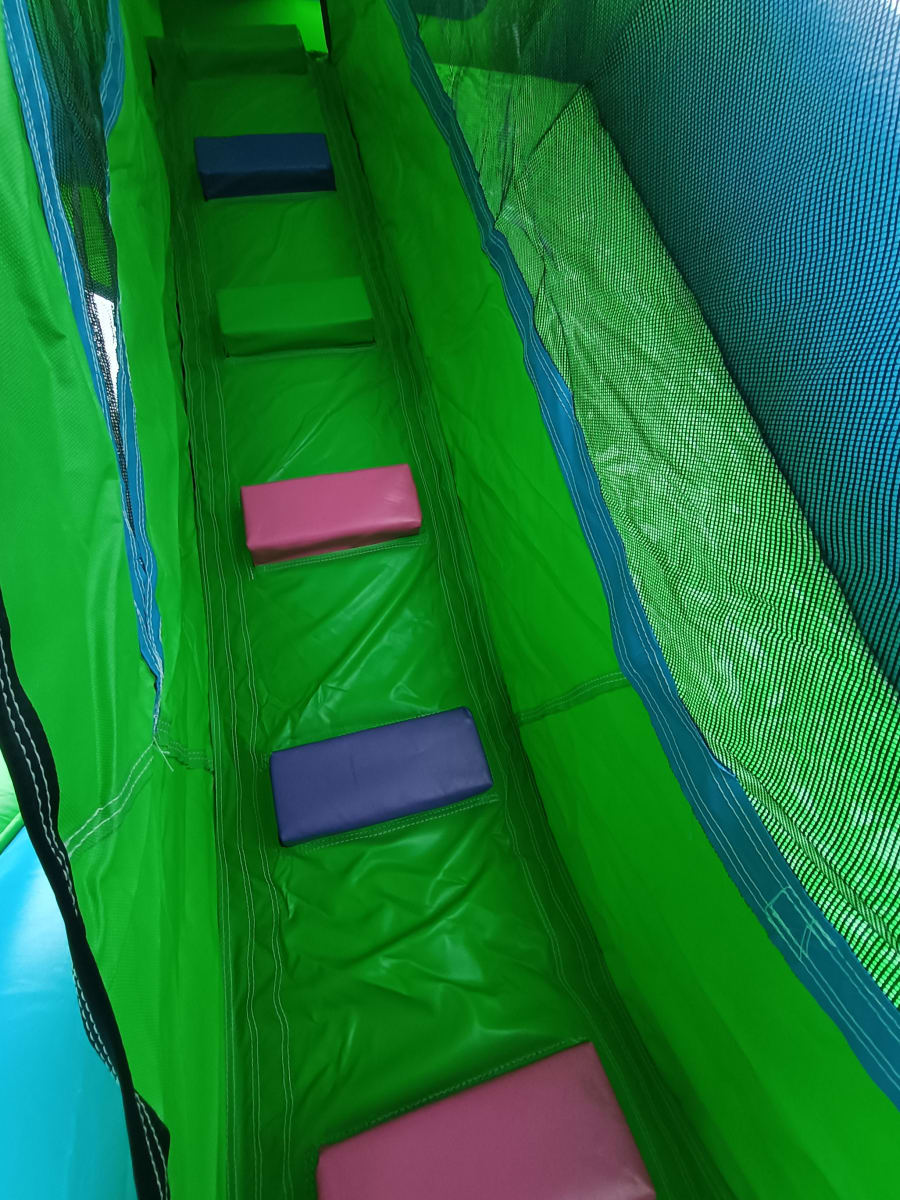 This bouncy castle is 16 foot long by 13 foot wide and has a 8 foot high slide.