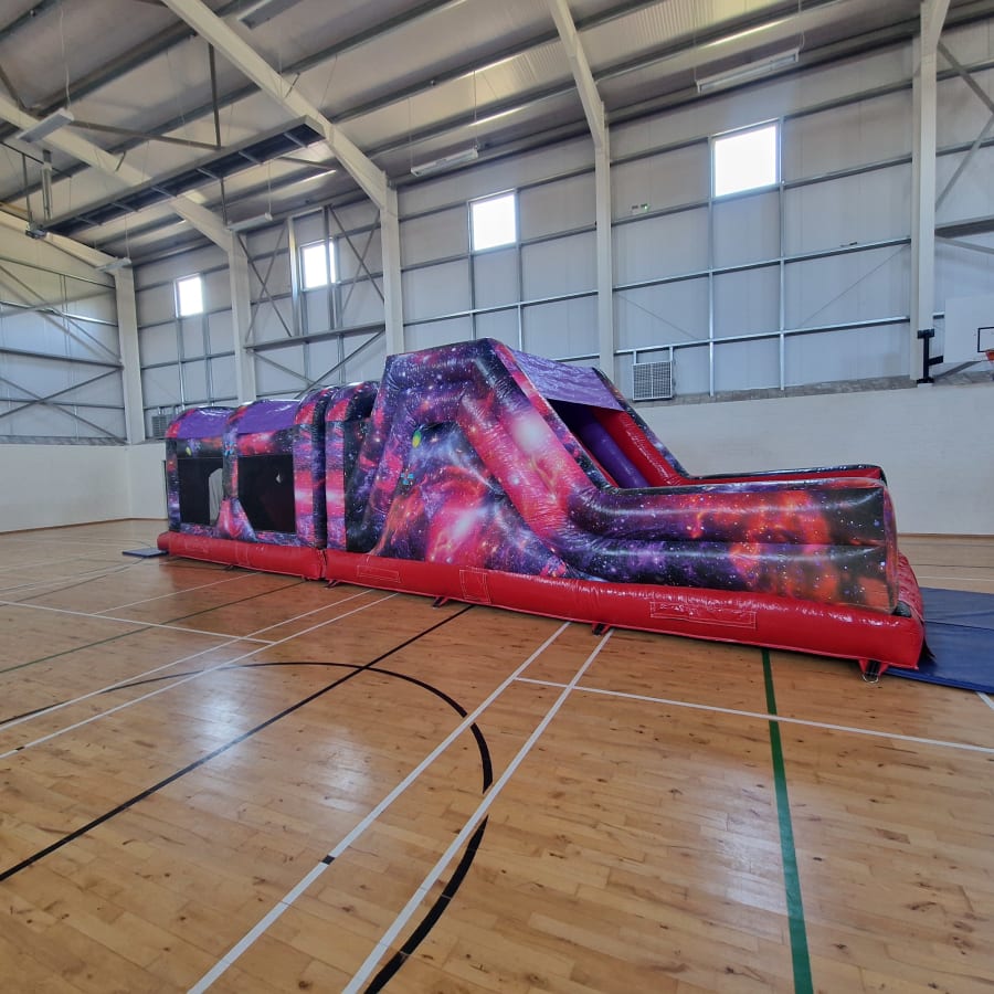 Looking for an unforgettable way to elevate your next event? The Galaxy Bouncy Castle Obstacle Course is the ultimate attraction for kids and adults alike! This spectacular 42-foot-long inflatable obstacle course is designed with a dazzling galaxy theme, featuring vibrant stars, planets, and cosmic colors that create an immersive adventure right in your backyard or party venue.