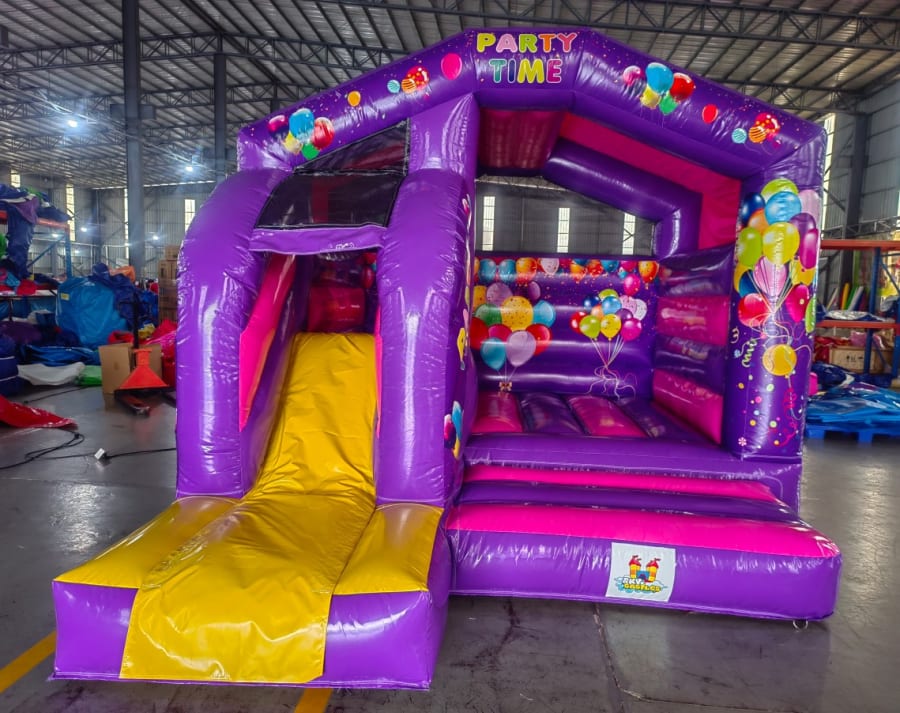 • Design: Pink and purple party theme — a favourite girls bouncy castle for birthdays and garden parties.