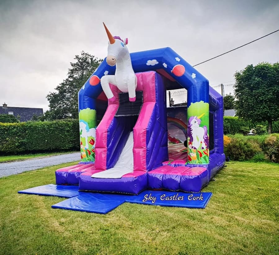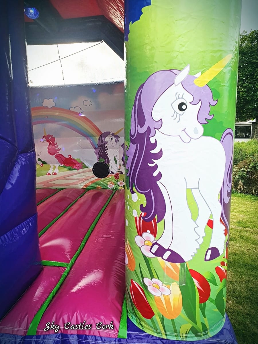 The Unicorn Bouncy Castle is an amazing new bouncy castle for hire here at Sky Castles Cork. Rather than just a regular bouncy castle, this magical unicorn-themed inflatable is a bounce and slide bouncy castle combo! This means it has a large bounce area and a 5 foot high slide also to keep the little ones busy all day long. It is full enclosed for safety and easy supervision and has a full rain cover in case of any showers.