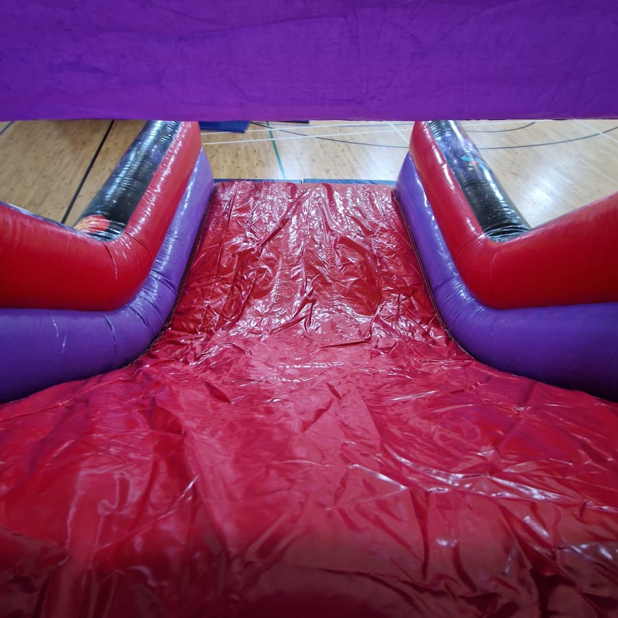 This obstacle course is 42 foot long by 10 foot wide and has a 7 foot high slide.